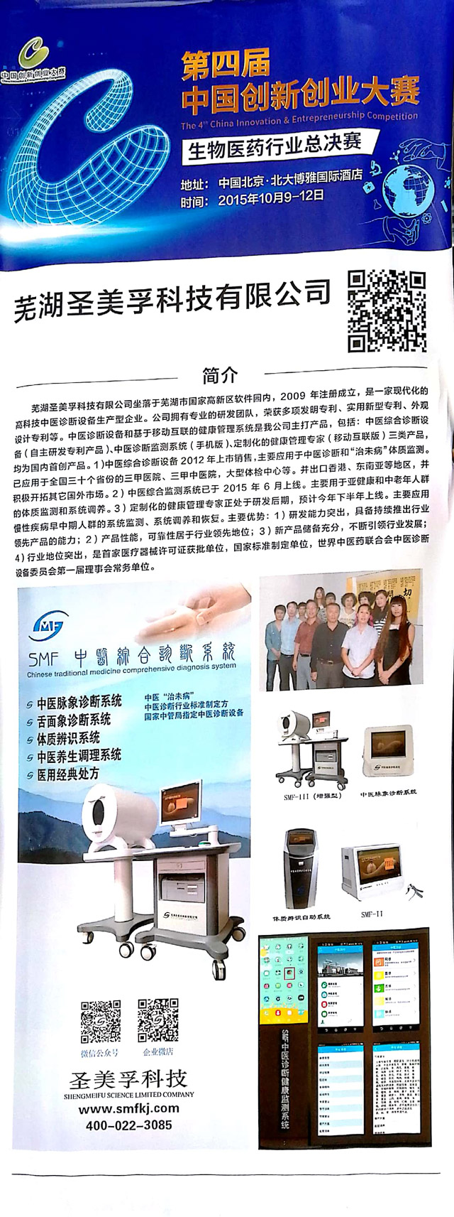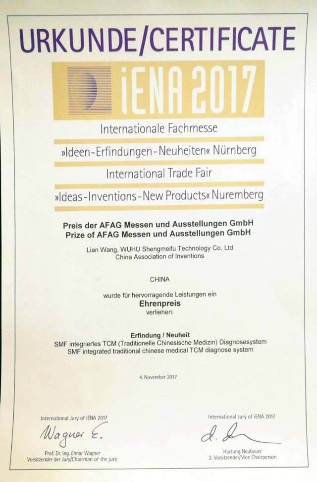 2015年,“中醫脈象診斷系統”、“SMF中醫舌面象儀”兩項產品入選全國衛生產業管理協會首批“治未病服務適宜設備”;