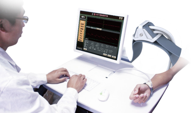 中醫(yī)脈象診斷系統(tǒng):利用計(jì)算機(jī),通過袖帶式傳感器,傳感器自身重量≤50克,在橈動(dòng)脈寸,關(guān),尺三個(gè)部位檢測脈象信號(hào),模仿中醫(yī)醫(yī)師指法,(傳感器Φ8圓形)更準(zhǔn)確的按照中醫(yī)舉、按、尋的診脈過程,浮、中、沉散布全自動(dòng)氣體加壓取脈,采集八個(gè)不同壓力段的脈象波形自助選擇佳壓力波形,并將脈象的位,數(shù),形,勢和脈圖的各項(xiàng)參數(shù)自動(dòng)分析,以判定脈象信息,用于臨床脈象檢測。